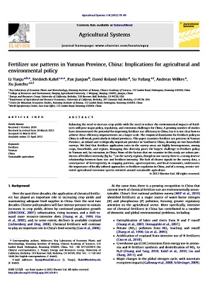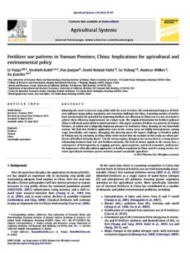 Yunju L, Kahrl F, Jianjun P, Roland-Holst D, Yufang S, Wilkes A, Jianchu X. 2012. Fertilizer use patterns in Yunnan Province, China: implications for agricultural and environmental policy. Agricultural Systems 110: 78-89.
