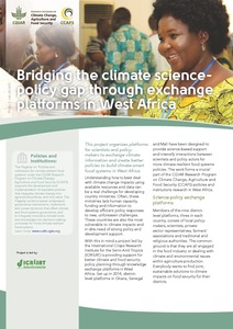 CCAFS. 2015. Bridging the climate science-policy gap through exchange platforms in West Africa. Project Flyer. Copenhagen, Denmark: CGIAR Research Program on Climate Change, Agriculture and Food Security (CCAFS).