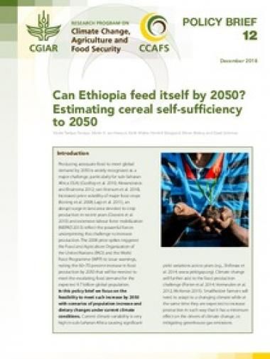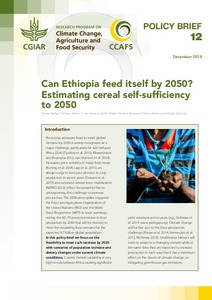 Tesfaye K, van Ittersum MK, Wiebe K, Boogaard H, Radeny M, Solomon D. 2018. Can Ethiopia feed itself by 2050? Estimating cereal self-sufficiency to 2050 .CCAFS Policy Brief no. 12. Wageningen, the Netherlands: CGIAR Research Program on Climate Change, Agriculture and Food Security (CCAFS).