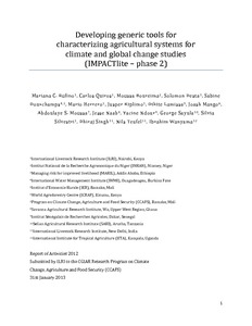 Rufino MC, Quiros C, Boureima M, Desta S, Douxchamps S, Herrero M, Kiplimo J, Lamissa D, Mango J, Moussa AS, Naab J, Ndour Y, Sayula G, Silvestri S, Singh D, Teufel N, Wanyama I. 2013. Developing generic tools for characterizing agricultural systems for climate and global change studies (IMPACTlite - phase 2).Report to CCAFS. Copenhagen, Denmark: CGIAR Research Program on Climate Change, Agriculture and Food Security (CCAFS).