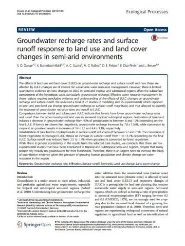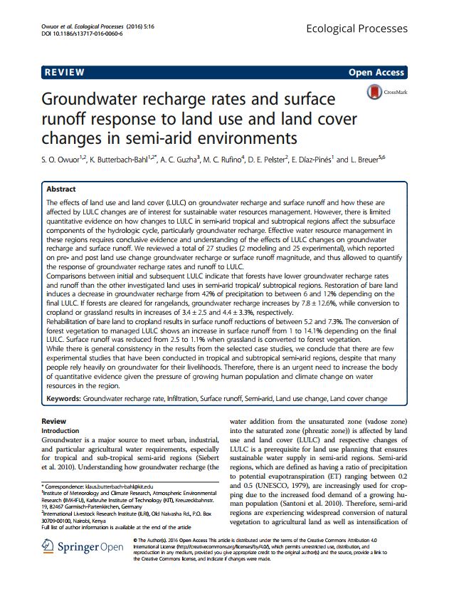 Owuor SO, Butterbach-Bahl K, Guzha AC, Rufino MC, Pelster DE, Díaz-Pinés E, Breuer L. 2016. Groundwater recharge rates and surface runoff response to land use and land cover changes in semi-arid environments. Ecological Processes 5:16.