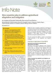Richards M, Bruun TB, Campbell B, Gregersen LE, Huyer S, Kuntze V, Madsen STN, Oldvig MB, Vasileiou I. 2015. How countries plan to address agricultural adaptation and mitigation: An analysis of Intended Nationally Determined Contributions. CCAFS Info Note. Copenhagen, Denmark: CGIAR Research Program on Climate Change, Agriculture and Food Security (CCAFS).