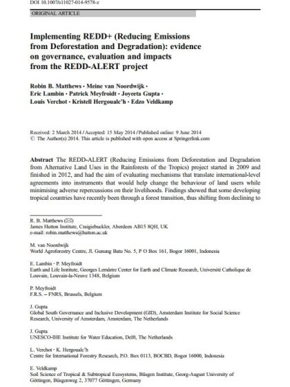 Matthews RB, van Noordwijk M, Lambin E, Meyfroidt P, Gupta J, Verchot L, Hergoualc’h K, Veldkamp E. 2014. Implementing REDD+ (Reducing Emissions from Deforestation and Degradation): evidence on governance, evaluation and impacts from the REDD-ALERT project. Mitigation and Adaptation Strategies for Global Change 19(6):907-925.