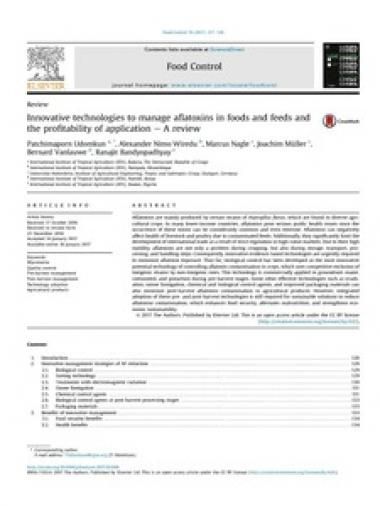 Udomkun, P., Wiredu, A.N., Nagle, M., Müller, J., Vanlauwe, B. & Bandyopadhyay, R. (2017). Innovative technologies to manage aflatoxins in foods and feeds and the profitability of application– a review. Food Control, 76, 127-138.