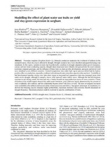 Kholová J, Tharanya M, Kaliamoorthy S, Malayee S, Baddam R, Hammer GL, McLean G, Deshpande S, Hash CT, Craufurd PQ, Vadez V. 2014. Modelling the effect of plant water use traits on yield and stay-green expression in sorghum. Functional Plant Biology 41(11):1019–1034.