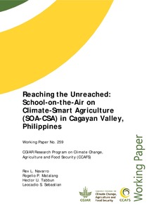 Navarro RL, Matalang RP, Tabbun HU, Sebastian LS. 2019. Reaching the Unreached: School-on-the-air on Climate-Smart Agriculture (SOA-CSA) in Cagayan Valley. CCAFS Working Paper No. 259. Wageningen, the Netherlands: CGIAR Research Program on Climate Change, Agriculture and Food Security (CCAFS).